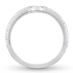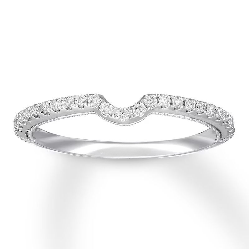 This wedding ring captures the modern beauty of a halo design. A brilliant 1 ct oval diamond center reflects a love of vintage design, while round diamonds add sparkle to the engagement ring’s split setting. The matching wedding band brings the total diamond weight to 1 7/8 carats. Both rings are crafted in 14K white gold.